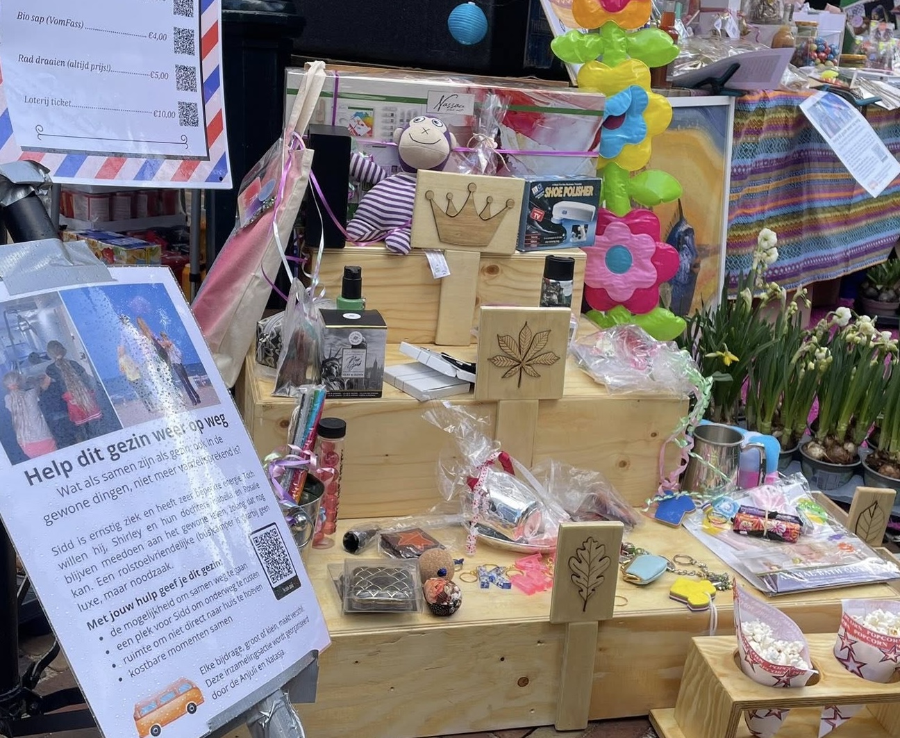 Op 28 maart stonden we op de puur natuurmarkt. Heel veel Wassenaarse ondernemers hebben spullen gedoneerd die we op de markt hebben verloot en verkocht. Op koningsdag staan we met een kraam in de langstraat.
